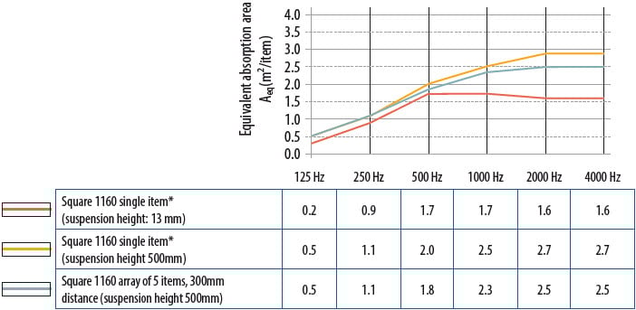 Les propriétés d'absorption acoustiques des îlots et baffles sont exprimées en aire d'absorption acoustique équivalente Aeq : elle s'exprime en m² par objet. La valeur Aeq est mesurée conformément à la norme ISO 354. Elle correspond à la surface d'une paroi absorbante fictive de Dw 1,00 ayant la même absorption que l'îlot ou le baffle testé L'aire d'absorption équivalente n'a pas de moyenne pondérée comparable à l'Alpha w. C'est pourquoi le meilleur moyen de comparer un plafond plat avec des îlots ou baffles est de calculer le temps de réverbération du son pour chaque pièce et situation